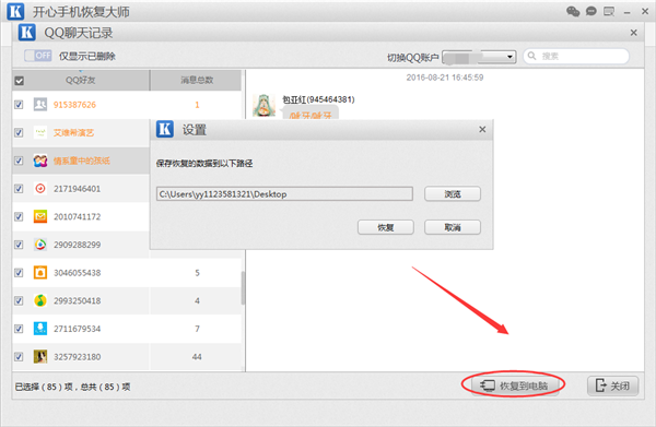 第六步:最后勾选出需要恢复的那些qq聊天记录选项进行勾选,然后点击“恢复到电脑”的按钮,就可以将这些数据恢复到电脑上保存查看了。