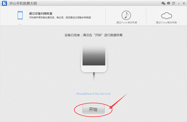 第三步、运行开心手机恢复大师,当看到界面上显示“设备已连接”之后,表示软件已经识别到设备了,点击下方【开始】则默认使用第一模式找回丢失的通讯录联系人;