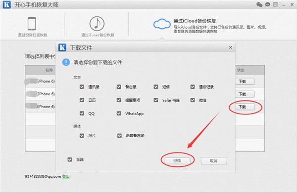 第二步:这款软件的三种模式都可以恢复苹果手机中的照片的,今天我们要选择的是第三模式,在开始界面选择“通过iCloud备份恢复”,然后输入自己的Apple ID和密码,进行登录;登陆成功之后,就来到了备份文件的预览界面,我们根据时间选择一个合适的备份,将备份文件下载下来,然后点击“继续”,就会跳转到数据恢复界面了;