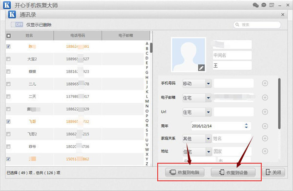 第五步、将需要恢复的iPhone手机通讯录联系人进行勾选,点击【恢复到设备】即可导回原来的iPhone手机中;点击【恢复到电脑】则可备份到电脑本地,方便以后查看恢复。