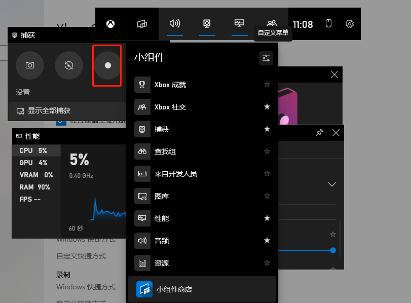 接着我们将允许录屏的按钮切换到“开启”状态,然后我们按下快捷键“Win+Alt+G”,即可打开录制界面;