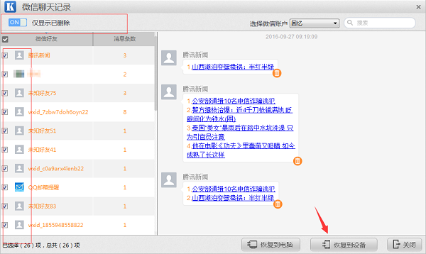 第四步:设备扫描结束后,跳转至微信聊天记录预览界面,扫描出来的微信聊天记录以两种颜色显示:黑色表示还存在手机里的微信聊天记录,橙色代表已删除的微信聊天记录。那么已删除的橙色字体的微信聊天记录怎么恢复呢?我们点击左上角【仅显示已删除】,处于ON状态,或者在右边的搜索框搜索需要恢复已删除的微信聊天记录,然后勾选列表左边的框,选择需要恢复的数据项,(默认为全选),进行已删除微信聊天记录的恢复操作。