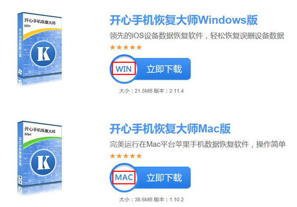 开心手机恢复大师是专业的苹果数据恢复和备份软件,有设备扫描恢复、iTunes备份恢复和iCloud备份恢复三种恢复模式对已删除数据进行恢复。我们使用设备扫描恢复,一招就能成功恢复删除的微信聊天记录。我们百度搜索“开心手机恢复大师”,或到官方下载地址(www.kxbox.com/download)下载开心手机恢复大师,下载后安装到电脑上。开心手机恢复大师支持Windows和Mac操作系统,我们根据电脑系统选其一即可。