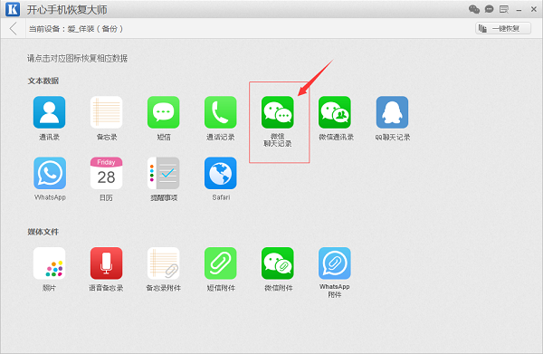 步骤三:然后,我们来到数据恢复的主界面。在这个界面中,我们可以对通讯录,备忘录,短信等其他数据项进行数据恢复。这里的话,我们要点击图标【微信聊天记录】进行下一步操作。
