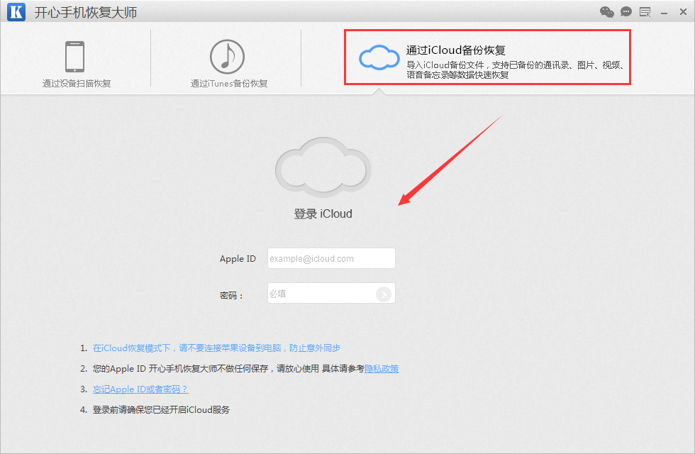 第二步:安装完之后运行软件,在主界面我们可以看到的是三种恢复模式,苹果手机自带iCloud可以同步备份数据,因此今天我们选择第三模式“通过iCloud备份恢复”,即使手机不在身边也可以找回手机丢失的通讯录,接着输入Apple ID和密码进行登录;