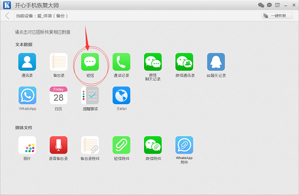 第三步:扫描结束后,我们来到数据恢复的主界面。在这个界面中,我们发现这款软件还可以对除短信以外的其他数据项进行恢复。接着,我们点击短信进入下个界面。