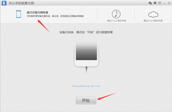 第三步:开心手机恢复大师有“通过设备扫描恢复”、“通过iTunes备份恢复”和“通过iCloud备份恢复”三种模式。我们选择“通过设备扫描恢复”模式(该模式无需备份)对微信记录进行恢复。我们点击“开始”继续。