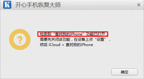 如果在将短信恢复到手机的过程中出现了下面的提示框,我们只需要在手机iCloud设置中关闭“查找我的iPhone”功能即可继续恢复。