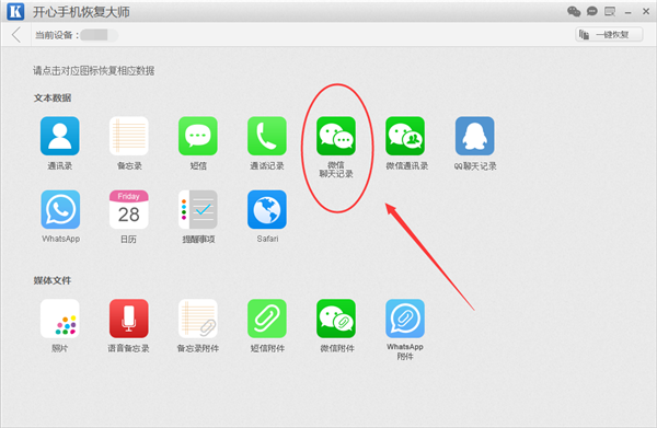 第三步:来到数据恢复界面之后,我们就可以看到许多开心手机恢复大师(下载地址:http://dl.pconline.com.cn/download/365970.html)支持恢复的数据项了,一共有十几种,今天我们直接找到“微信聊天记录”图标进行点击,然后软件就会自动进行扫描分析了;
