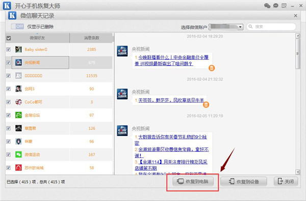 第六步、在需要恢复的微信聊天记录左侧的方框中打勾,点击【恢复到电脑】就可以将删除的微信聊天记录备份到电脑本地方便以后查看了!
