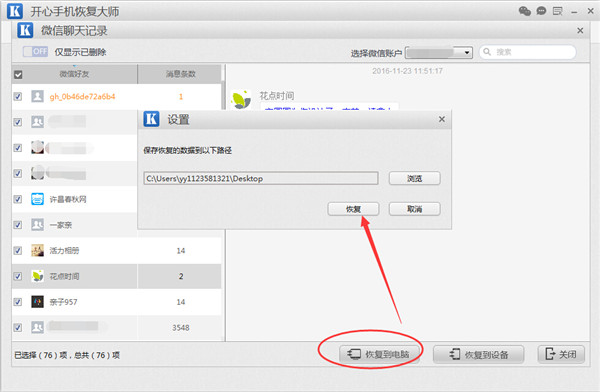第五步: 我们在相对应的微信聊天记录的左侧方框中勾选,然后点击右下角的“恢复到电脑”的按钮就可以将记录恢复到电脑上了,点击“浏览”可以选择你想要保存的文件夹就可以了。