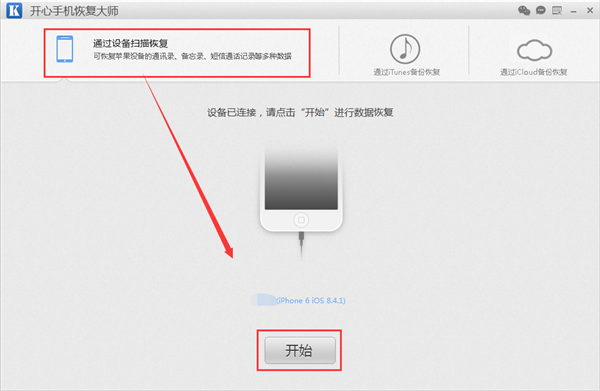 第二步:直接运行软件,接着将手机连接到电脑上,等软件成功识别到手机的时候,我们就可以直接默认第一模式“通过设备扫描恢复”,然后点击界面下方出现的“开始”按钮,继续下一步恢复操作了;如果是第一次连接是需要点击信任此电脑的;