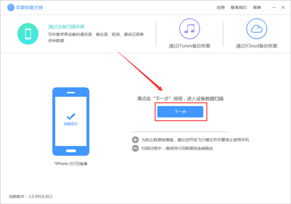 第三步、运行苹果恢复大师,使用默认的第一模式来恢复苹果手机中删除的微信聊天记录,所以当界面上显示“设备已连接”,表示软件识别到了设备,点击【下一步】继续;