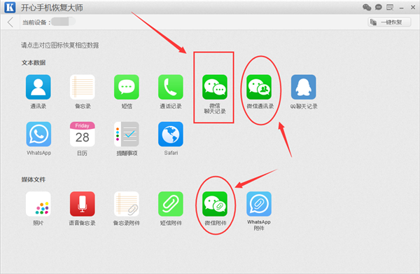 第三步:来到数据恢复模式之后,我们在界面上看到许多的数据项图标,现在我们要查看的微信聊天记录,所以可以直接点击“微信聊天记录”图标;当然我们还可以看到“微信附件”和“微信通讯录”图标,点击它们分别可以恢复微信聊天记录中的语音等附件和微信好友的,有需要的小伙伴可以自行尝试哦;