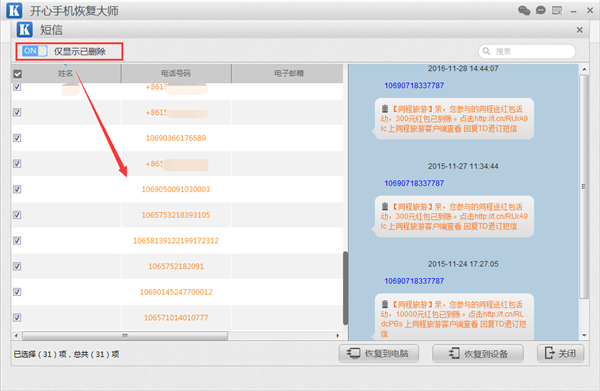 第五步:我们在界面左侧勾选想要恢复的短信记录,然后点击右下角的“恢复到电脑”按钮,就可以将这部分短信内容导出到电脑上面了;当然点击右下角的“恢复到设备”按钮按钮的话,也可以将恢复出来的短信直接导回到自己的设备上的。