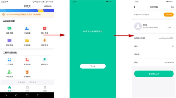 运行卓师兄,仔细阅读《用户隐私保护》后,点击首页的【好友恢复】,根据提示进行操作,等待深度扫描完成后点击底部【通讯录】图标,即可查看被误删微信联系人列表;开通权限即可查看恢复回来的好友详细资料了,也可把微信好友的微信号等资料全部导出,详情见下图。