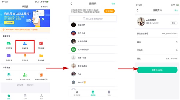 运行卓师兄,仔细阅读《用户隐私保护》后,点击首页的【好友恢复】,根据提示进行操作,等待深度扫描完成后点击底部【通讯录】图标,即可查看被误删微信联系人列表;开通权限即可查看恢复回来的好友详细资料了,也可把微信好友的微信号等资料全部导出,详情见下图:
