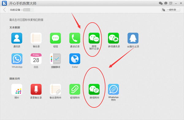 第三步:这时候进入到数据恢复界面,我们可以看到有很多图标,这些图标表示这些数据都可以通过开心手机恢复大师来恢复的。现在我们直接找到“微信聊天记录”图标并点击,如果还想恢复微信聊天中的图片,语音等文件,可以直接点击“微信附件”进行扫描;
